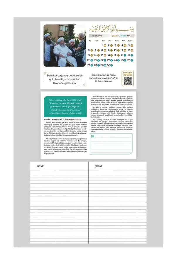 Mahmud Efendi Hazretlerimizin resimleriyle süslenmiş, oldukça şık tasarlanmış olan bu takvimde, Efendi Hazretlerimizden nakşedilen hikmetli sözleri okuyup o aya ait hicri ve miladi günleri takip edebileceksiniz. İlgili hicri aya ait bilgiler, ibadetler ve zikirlere ulaşabileceksiniz.