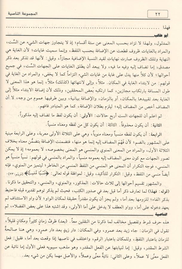 "المجموعة الناصية" ، مجموعة تشتمل على أربعة كتب قيمة: "متن ألفية ابن مالك" لجمال الدين ابن مالك الأندلسي الجياني الدمشقي في النحو والصرف، أشهر متون علم النحو والصرف، وشرحه "البهجة المرضية على الألفية" لجلال الدين السيوطي، وهو من أفضل شروح الألفية المختصرة، المشهورة بــــ"شرح السيوطي على الألفية"، و"حاشية أبي طالب" لميرزا أبي طالب، وهي من أوسع وأعمق الحواشي على "البهجة المرضية"، و"حاشية محمد نوري ناص الاستلي".
