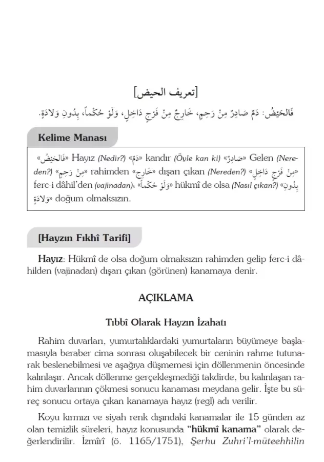 Hanefi mezhebinde muzille (adet döngüsünü unutup devamlı kanama gören kadın) ile ilgili hükümlerin uygulanması oldukça zor olduğundan, eserin sonuna Maliki mezhebine göre hayız ve nifas hükümleri ilave edilmiş ve muzille kadınların bu konuda Maliki mezhebindeki müstahâze kadın hükümlerine göre amel etmeleri tavsiye edilmiştir. Ayrıca hayızla ilgili sıkça sorulan güncel meseleler müstakil bir başlık altında soru-cevap şeklinde ele alınmıştır.